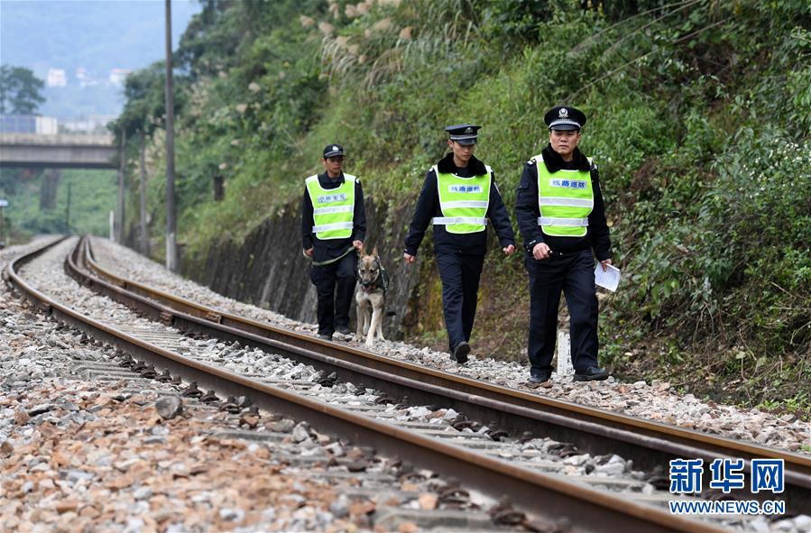 陸日峰(前)和同事在中越邊境巡線(2018年12月31日攝)。陸日峰是南寧鐵路公安處憑祥站派出所民警,中越國際客運(yùn)列車開行10年,他就守護(hù)了10年。十年來,他平均每3天要到中越鐵路交界點(diǎn)的湘桂線鐵路終點(diǎn)巡線。