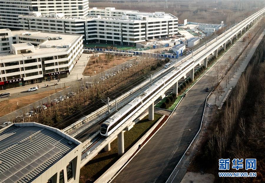這是2018年12月29日無(wú)人機(jī)拍攝的車輛通過濟(jì)南軌道交通1號(hào)線創(chuàng)新谷站。新華社記者朱崢攝