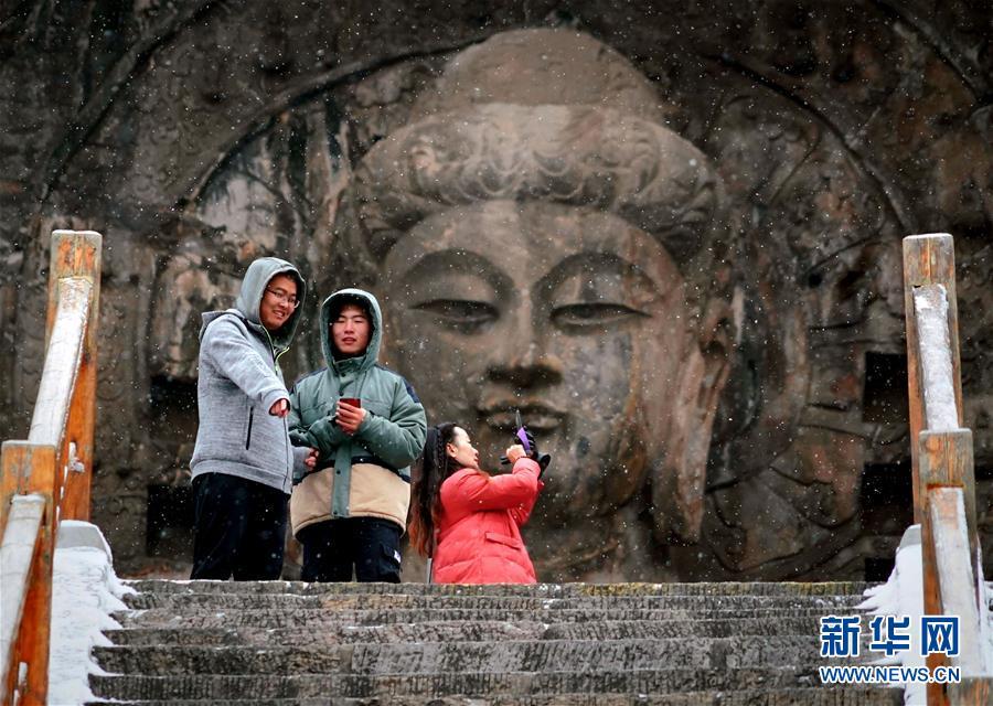 1月9日,游客在洛陽(yáng)龍門石窟景區(qū)內(nèi)的盧舍那大佛前拍照賞景。新華社記者李安攝