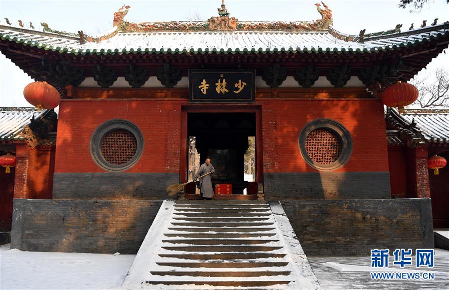 1月10日,一位僧人在少林寺內(nèi)清掃積雪。當(dāng)日,雪后初霽,河南登封少林寺分外秀美。 新華社記者 李嘉南 攝
