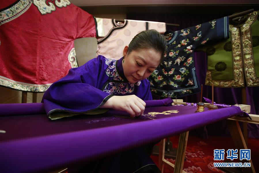 1月12日,在北京“碧泓云想”服裝設(shè)計(jì)工作室,高定服裝設(shè)計(jì)師畢紅在為中式服裝制作刺繡紋樣。畢紅設(shè)計(jì)的中式服裝以棉、麻、真絲等面料為主。春節(jié)來(lái)臨,其團(tuán)隊(duì)加班加點(diǎn)為顧客趕制中式服裝。