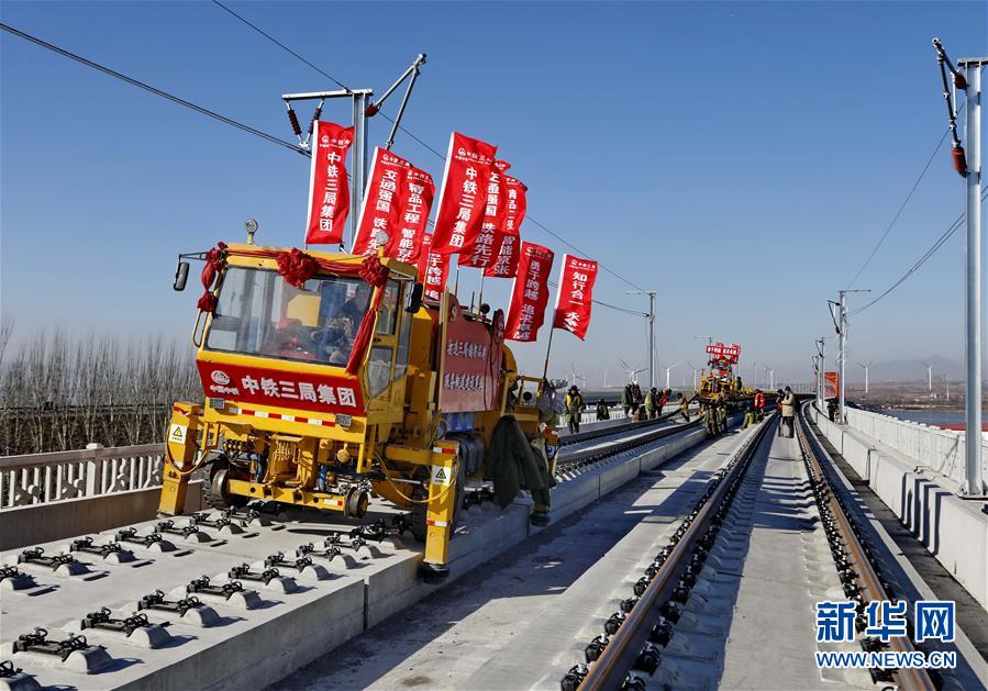 1月13日,中鐵三局的工人在京張高鐵官?gòu)d水庫(kù)特大橋進(jìn)行鋪軌作業(yè)。 新華社記者 楊世堯 攝