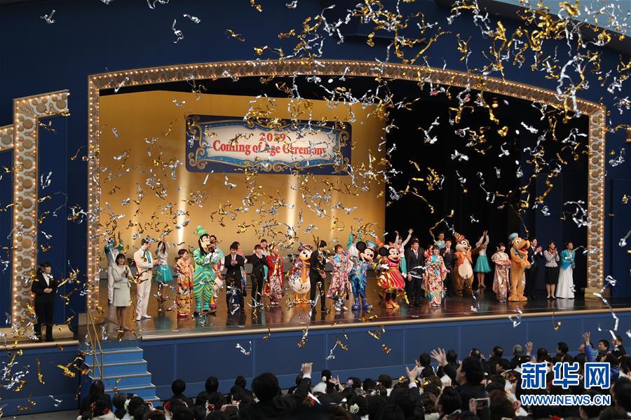 1月14日,在日本千葉縣的東京迪士尼樂(lè)園,迪士尼卡通人物與參加“成人禮”的年輕人共同慶祝。新華社記者杜瀟逸攝