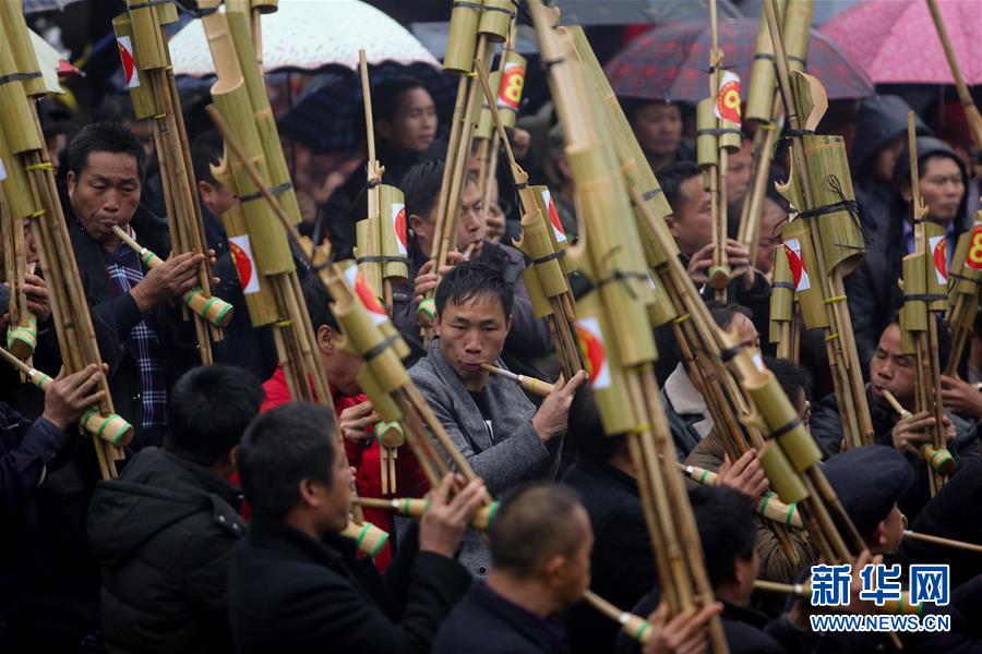 1月14日,人們?cè)趶V西融水苗族自治縣紅水鄉(xiāng)舉行的蘆笙節(jié)上賽蘆笙。