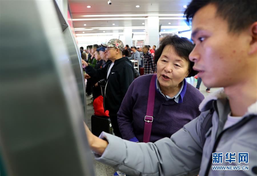1月15日,廣東湛江青年許東濱(右)在廣州火車站售票大廳內(nèi)的自助售票終端上買完車票后,順便幫助一位老人查詢車票信息。 為適應(yīng)互聯(lián)網(wǎng)購票旅客比重持續(xù)上升趨勢,廣州火車站在籌備2019年春運(yùn)票務(wù)業(yè)務(wù)時(shí),優(yōu)化互聯(lián)網(wǎng)購票取票和退改簽業(yè)務(wù)辦理流程設(shè)計(jì),提升效率,方便旅客出行。 新華社記者劉大偉攝