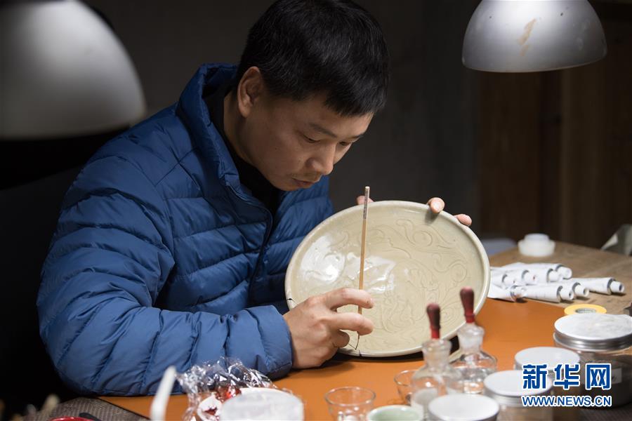 1月15日,吳榮強在龍泉市牛頭嶺村“七分醉”工作室對一件青瓷器皿進(jìn)行漆繕。