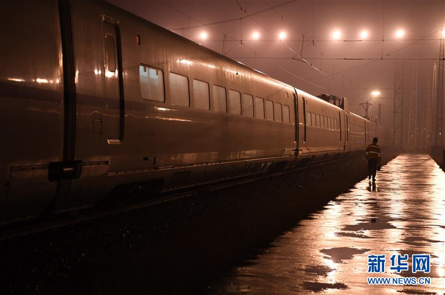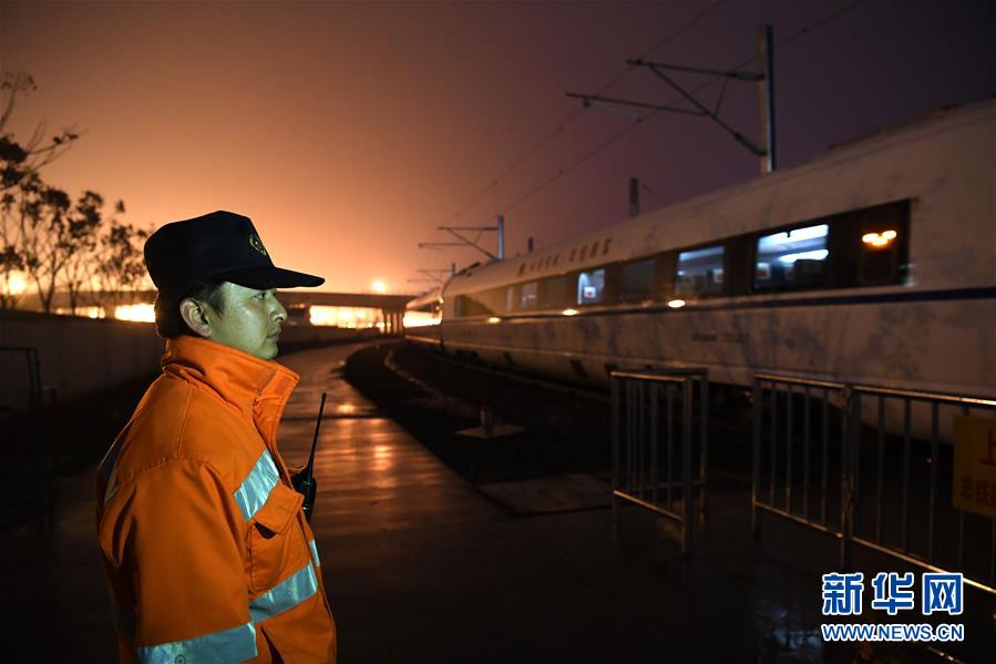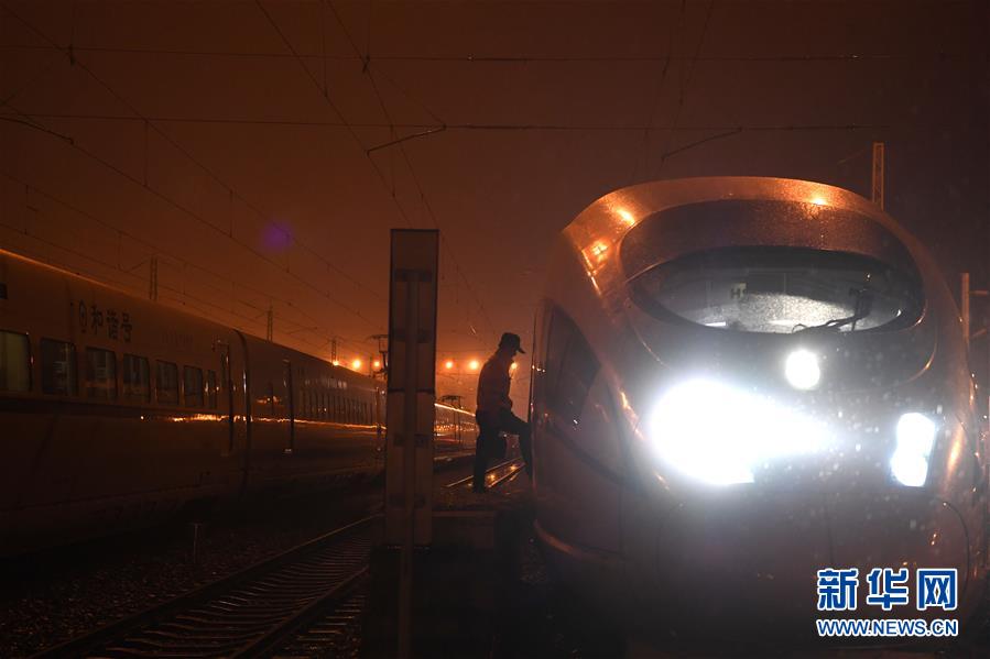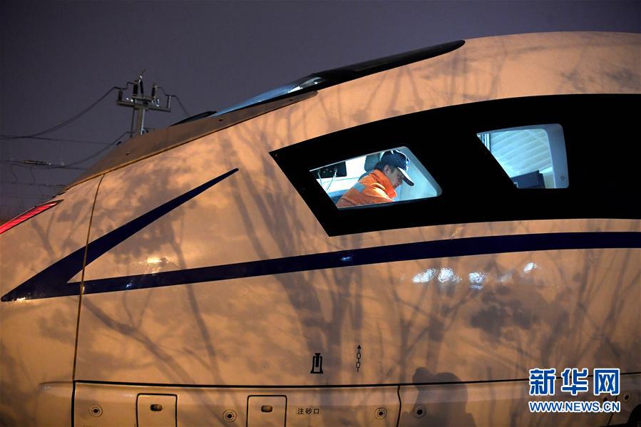 1月29日,王瑞在合肥南動(dòng)車運(yùn)用所進(jìn)行動(dòng)車組連掛作業(yè)。新華社記者劉軍喜攝