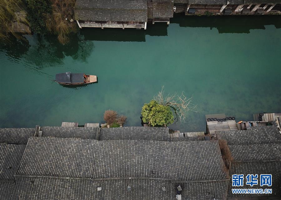2月25日,游人在烏鎮(zhèn)景區(qū)內乘船觀光(無人機拍攝)。 隨著氣溫升高,浙江省桐鄉(xiāng)市烏鎮(zhèn)景區(qū)春意萌動。 新華社記者翁忻旸攝