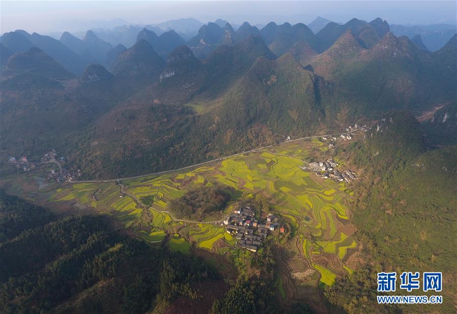 3月20日在貴州錦屏縣敦寨鎮(zhèn)拍攝的春景(無人機拍攝)。春分將至,貴州各地成片的油菜花漸次綻放,如同金色的地毯鋪上云貴高原。 新華社記者 歐東衢 攝
