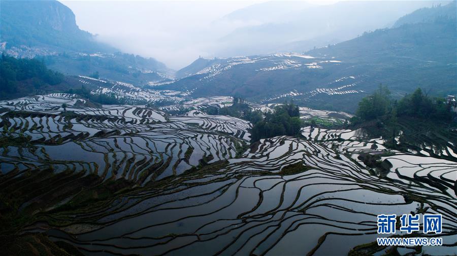這是在云南省元陽縣拍攝的晨曦中的哈尼梯田美景(4月4日無人機(jī)拍攝)。哈尼梯田位于云南省哀牢山南部,以哈尼族為主的當(dāng)?shù)厝罕娗О倌陙砩幌⒃诖蟮厣稀暗窨獭背鲞@一農(nóng)耕文明奇觀。春日里,漫山的水稻梯田與云海、森林、村莊形成一幅美麗的畫卷,吸引眾多海內(nèi)外游客前來觀賞。新華社記者 胡超 攝