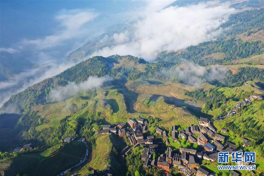 龍勝各族自治縣和平鄉(xiāng)平安村一景(4月7日無人機(jī)拍攝)。連日降雨過后,廣西龍勝各族自治縣和平鄉(xiāng)平安村的壯族村寨迎來久違的朝陽。 新華社記者 曹祎銘 攝