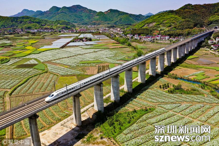 2019年4月8日,一列高鐵列車從京福高鐵安徽銅陵段一片盛開的鳳丹花海中駛過。隨著氣溫回升,安徽省銅陵市境內的鳳丹競相綻放,高鐵列車穿行其間,成為春日里一道美麗的風景線。