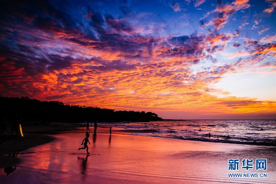 這是2014年12月22日在美國(guó)夏威夷州夏威夷大島科納附近拍攝的日落時(shí)分的火燒云和海灘。 新華社記者朱煒攝