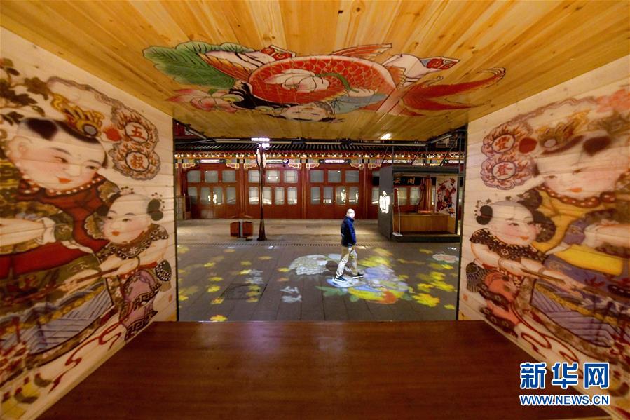 12月4日,一名游客走在布滿楊柳青年畫主題燈光的步行街上。 近日,天津市西青區(qū)楊柳青古鎮(zhèn)在步行街新增9組以楊柳青年畫代表作為主題的動(dòng)態(tài)夜景燈光,講述古鎮(zhèn)與年畫的歷史。 新華社記者 岳月偉 攝
