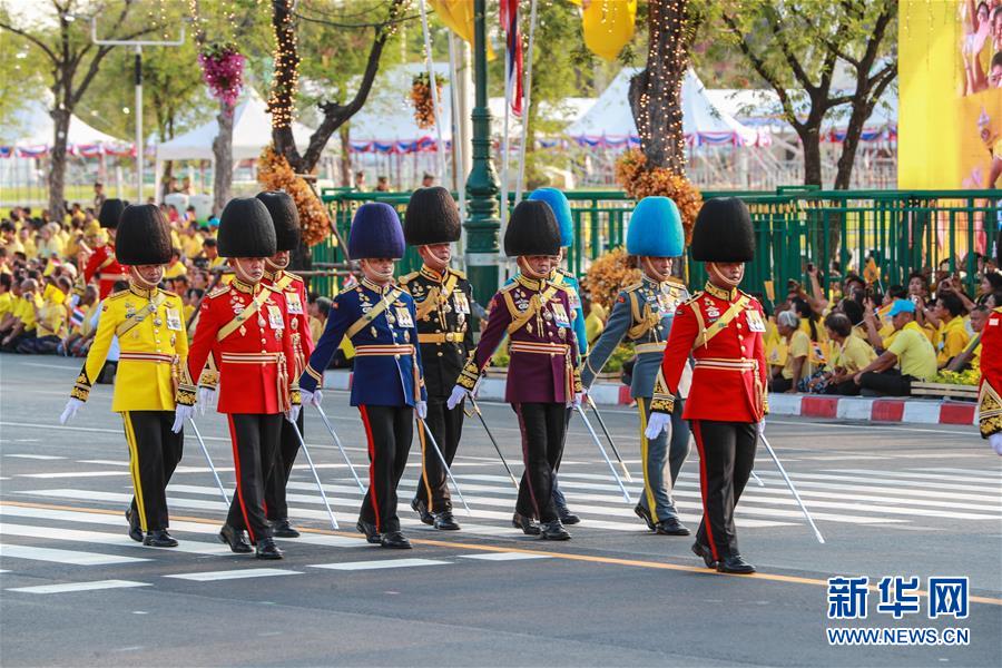 5月5日,儀仗隊(duì)在曼谷大王宮附近舉行的泰國(guó)國(guó)王加冕典禮巡游上列隊(duì)前進(jìn)。 新華社記者 張可任 攝