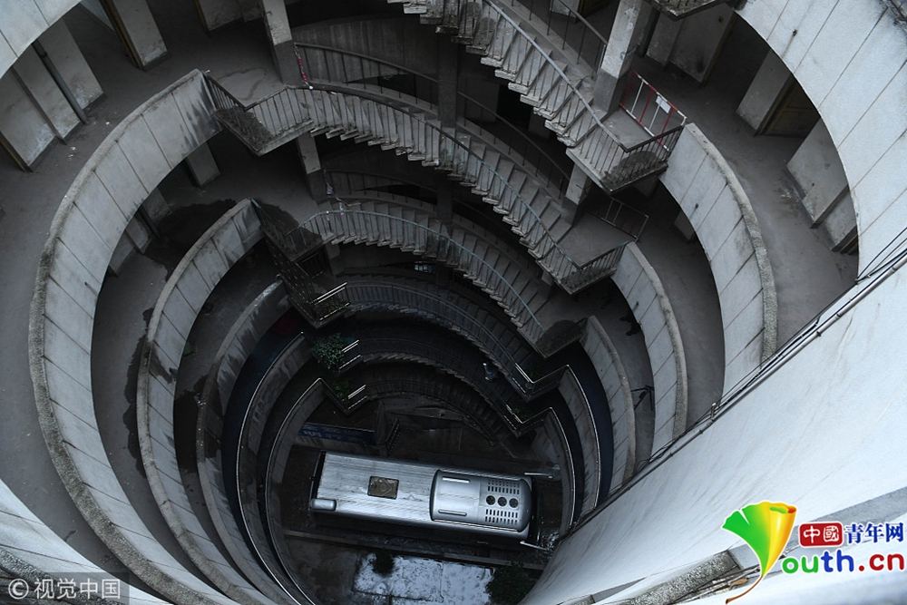 探秘重慶魔幻八層圓筒型轉(zhuǎn)轉(zhuǎn)樓 公交車穿其而過(guò)