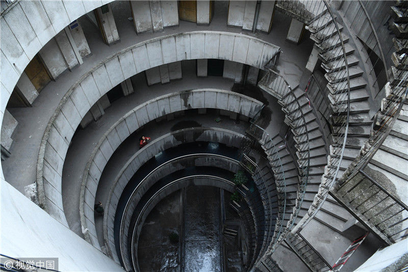 2018年12月6日,重慶江北紅旗河溝汽車站內(nèi),有一棟獨(dú)特的八層圓環(huán)狀建筑,底層每天有不少進(jìn)出站的客車通行。據(jù)悉,這棟樓建于1990年,曾經(jīng)是車站旅館,如今一、二兩層用于車站辦公,其余樓層已廢棄。為確保安全,三層以上已經(jīng)被封鎖。圖為公交車穿過(guò)8層空心圓筒樓。徐勇/視覺(jué)中國(guó)