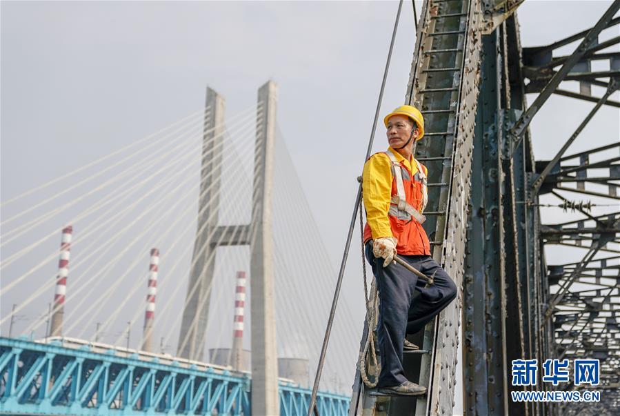 中國鐵路成都局有限公司重慶工務段53歲的橋隧工唐金華在白沙沱長江大橋的作業(yè)點上望著新白沙沱長江特大橋(4月23日攝)。 4月23日下午5點40分,隨著重慶白沙沱長江大橋通行的最后一列客運列車順利通過,這座“服役”了59年的重慶首座長江大橋進入“退役”倒計時。4月24日后,所有列車將改線經(jīng)距白沙沱長江大橋約100米的新白沙沱長江特大橋通行,新橋“接力”老橋,運輸能力將得到大幅提升。 白沙沱長江大橋于1958年開工,1960年通過首趟列車,是繼武漢長江大橋之后的第二座長江大橋。 新華社記者 劉潺 攝