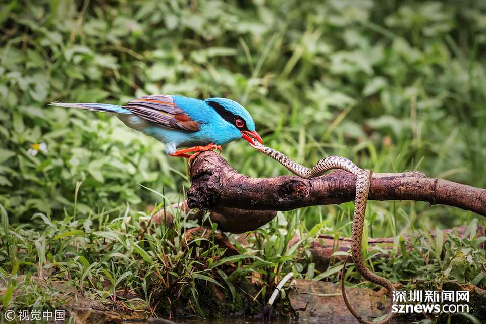 2018年7月18日,廣東東莞,藍(lán)綠鵲與蛇的地盤爭(zhēng)斗。