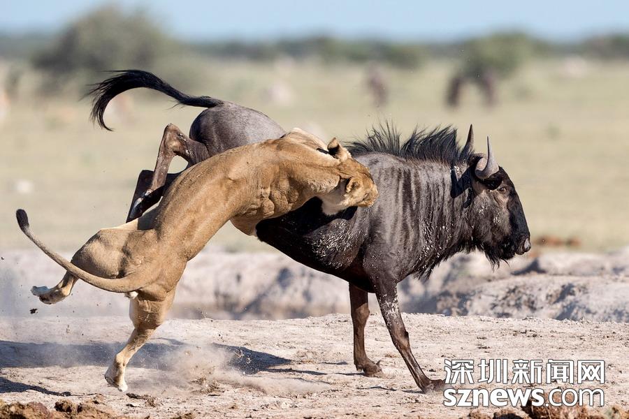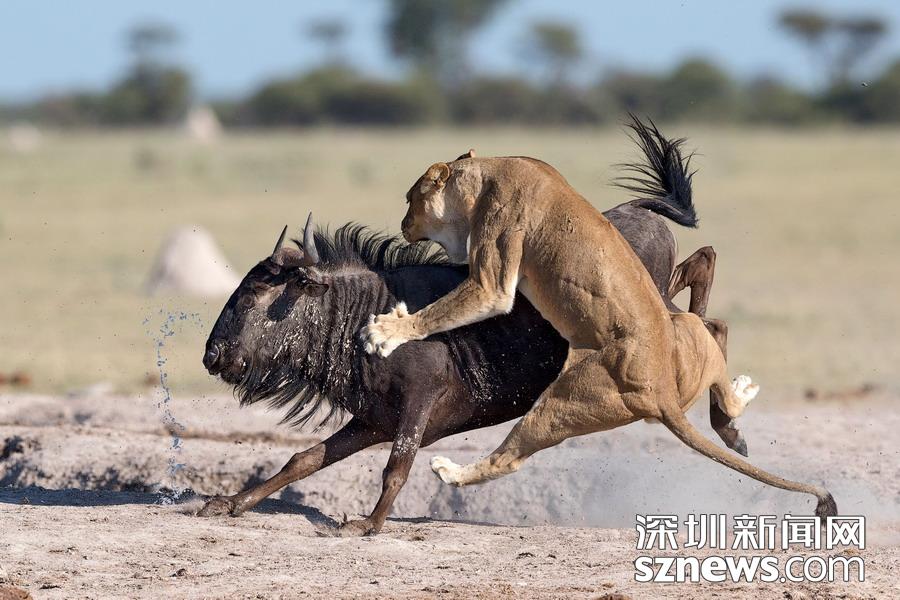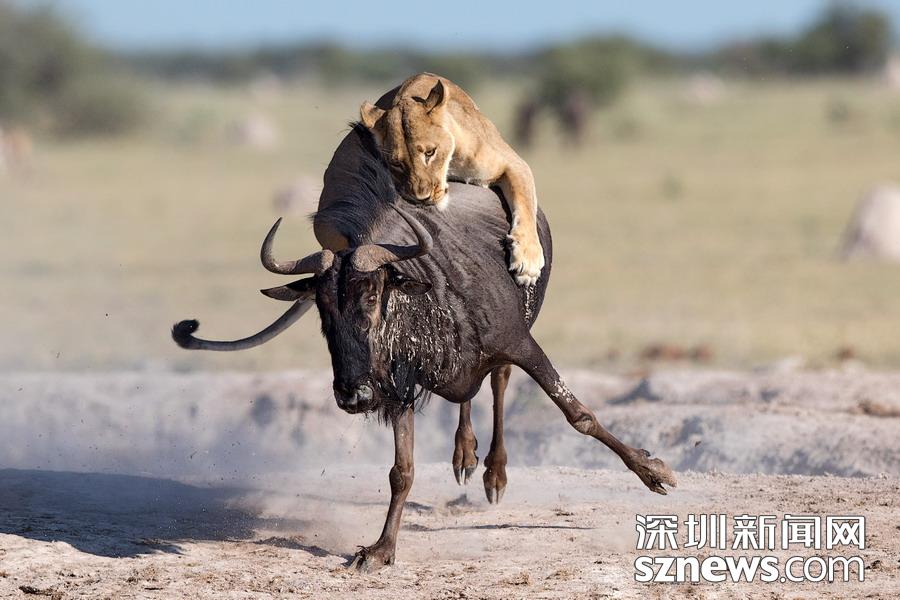 英國(guó)攝影師蘇-莫里斯(Sue Morri)在博茨瓦納Nxai Pan國(guó)家公園游玩,目睹了一場(chǎng)兇惡母獅獵食角馬的畫(huà)面。母獅甚至攀到了角馬背上,想要牢牢遏制住到手的“美餐”。強(qiáng)壯的角馬努力地與母獅抗?fàn)帲吡ο胍W∽约旱男悦?,但最終還是不敵母獅被拿下,最后成了母獅孩子們的盤(pán)中餐。