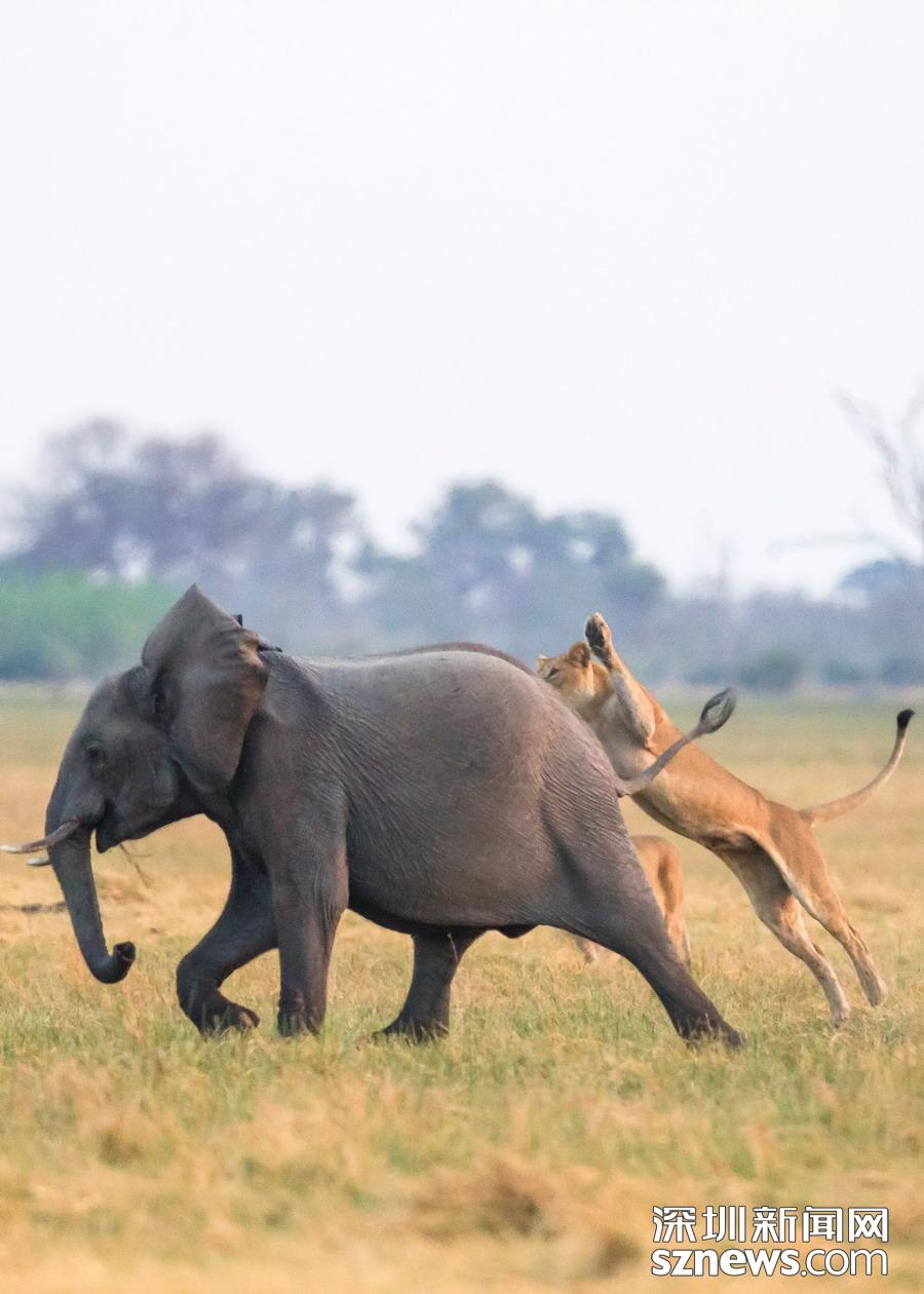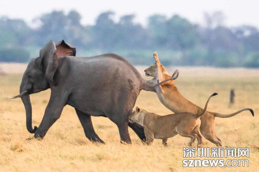 英國(guó)攝影師詹姆斯(James Gifford)在博茨瓦納喬貝國(guó)家公園拍到一群獅子獵食大象的精彩畫(huà)面。在詹姆斯的鏡頭下,一頭母獅跳到了一頭小象的背上想要將其拿下,但僅憑一己之力又不能做到。但當(dāng)母獅的后援抵達(dá)時(shí),象群也趕到了現(xiàn)場(chǎng)。最終,小象回到了象群中獲得庇護(hù),而獅群也不得不悻悻離去。