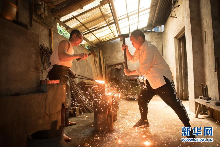 5月21日,鄭國(guó)榮和兒子鄭劍威在“古越劍鋪”對(duì)坯料進(jìn)行鍛打。 鄭國(guó)榮,1964年生于浙江龍泉,已經(jīng)跟寶劍打了30多年的交道。1982年他作為學(xué)徒進(jìn)入龍泉市寶劍廠,1994年劍廠改制后,成立了工作室“古越劍鋪”,開始獨(dú)立的鑄劍生涯。 從兵器到精神的象征,鄭國(guó)榮一直對(duì)寶劍懷有敬畏之心。在他的工作室,一把寶劍,從理念形成、圖紙?jiān)O(shè)計(jì)、備料到制作整合一般需要兩三個(gè)月。自劍鋪成立以來(lái),他已帶了20多個(gè)徒弟,如今都成了有名的鑄劍師。他的兒子也在畢業(yè)后跟隨他鑄劍,目前已基本掌握了全流程的鑄造技藝。 新華社記者翁忻旸攝