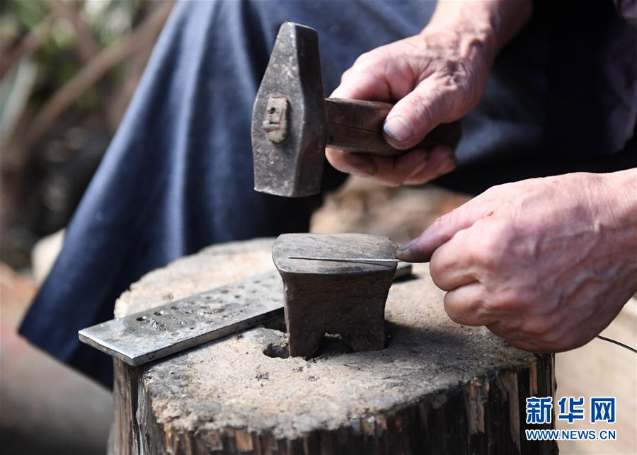 5月29日,在廣西融水苗族自治縣融水鎮(zhèn),銀匠陳四先在打造苗族銀飾。