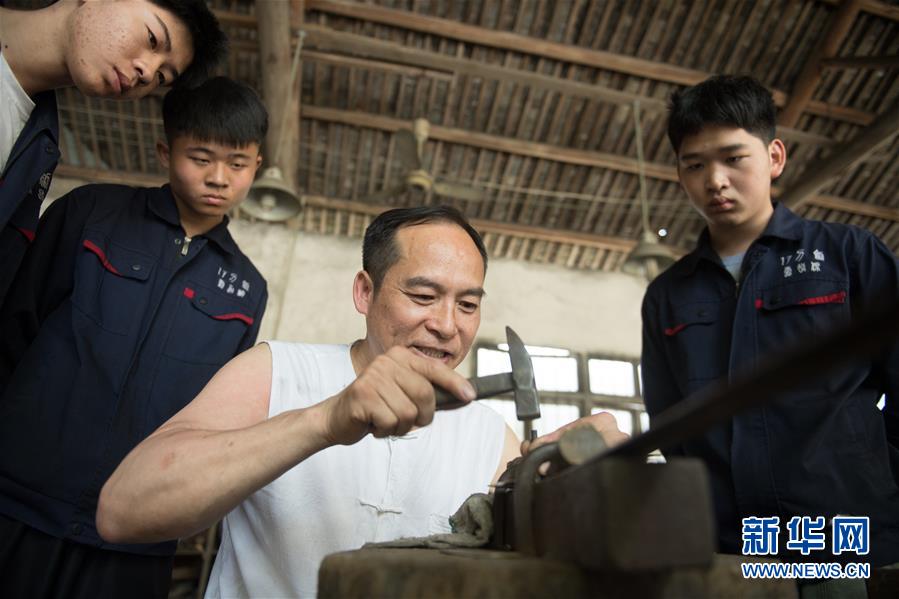 5月21日,鄭國(guó)榮的徒弟們?cè)凇肮旁絼︿仭睂W(xué)習(xí)寶劍鍛打技藝。 新華社記者 翁忻旸 攝