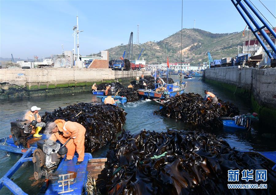 4月10日,霞浦縣長春鎮(zhèn)海帶養(yǎng)殖戶在埕塢碼頭吊運海帶。近日,福建省寧德市霞浦縣30余萬畝養(yǎng)殖海帶進入收獲季節(jié),當(dāng)?shù)仞B(yǎng)殖戶搶抓晴好天氣,收獲海帶。海帶養(yǎng)殖是霞浦縣群眾增收致富的支柱產(chǎn)業(yè)。2018年該縣海帶產(chǎn)量14萬余噸。新華社記者 姜克紅 攝