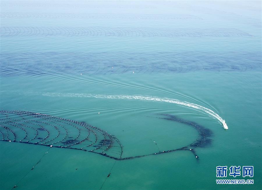 4月10日,霞浦縣長春鎮(zhèn)海域,海帶養(yǎng)殖戶在用船只收獲海帶(無人機拍攝)。近日,福建省寧德市霞浦縣30余萬畝養(yǎng)殖海帶進入收獲季節(jié),當(dāng)?shù)仞B(yǎng)殖戶搶抓晴好天氣,收獲海帶。海帶養(yǎng)殖是霞浦縣群眾增收致富的支柱產(chǎn)業(yè)。2018年該縣海帶產(chǎn)量14萬余噸。新華社記者 姜克紅 攝
