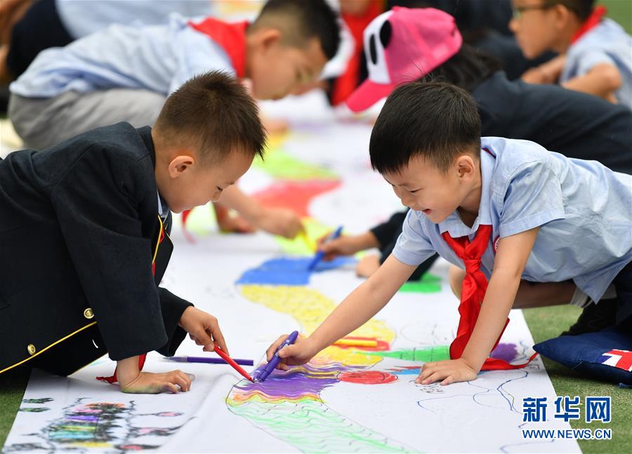 6月5日,陜西師范大學(xué)附屬小學(xué)的學(xué)生在長(zhǎng)卷上畫(huà)龍舟。新華社記者 張博文 攝