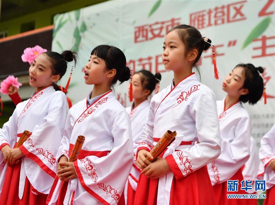 當(dāng)日,陜西師范大學(xué)附屬小學(xué)在位于西安的校園里舉行傳統(tǒng)民俗活動(dòng)迎接即將到來(lái)的端午節(jié)。