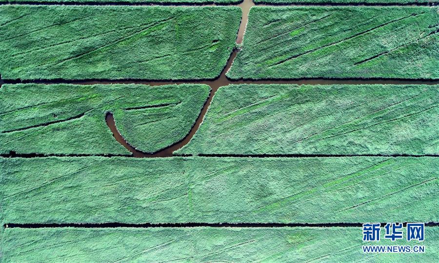 這是天津市寧河區(qū)七里海濕地內(nèi)蘆葦和水面形成的圖案(6月22日無(wú)人機(jī)拍攝)。新華社記者 岳月偉 攝