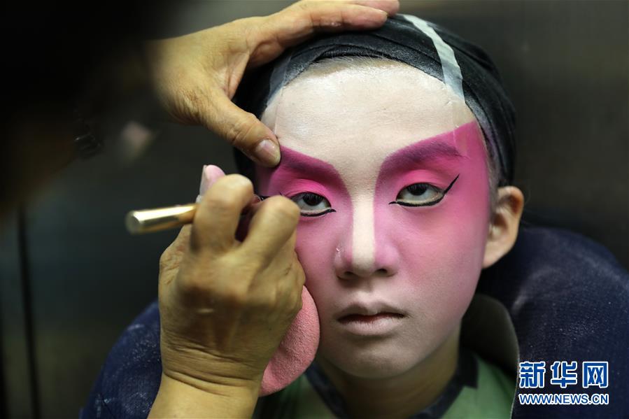 粵劇小演員陸瑞徽在畫(huà)經(jīng)典“紅白臉”妝容(6月8日攝)。 聲輝粵劇推廣協(xié)會(huì)成立于2003年,是香港重要粵劇藝術(shù)團(tuán)體之一,致力于向青少年推廣粵劇。協(xié)會(huì)目前有兩個(gè)初班,3個(gè)中班,一個(gè)青少年班?;泟∮址Q“廣東大戲”,表演技藝包括“唱做念打”,即唱功、身段、臺(tái)詞、武打,主要流行于廣東、廣西和香港、澳門(mén)等地區(qū)。2009年,粵劇被列入聯(lián)合國(guó)教科文組織人類非物質(zhì)文化遺產(chǎn)代表作名錄,今年正逢十周年。 新華社記者 吳曉初 攝