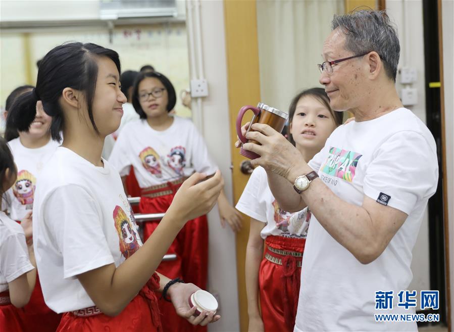 孩子們給79歲的粵劇名伶楊劍華敬茶(6月8日攝)。 聲輝粵劇推廣協(xié)會(huì)成立于2003年,是香港重要粵劇藝術(shù)團(tuán)體之一,致力于向青少年推廣粵劇。協(xié)會(huì)目前有兩個(gè)初班,3個(gè)中班,一個(gè)青少年班?;泟∮址Q“廣東大戲”,表演技藝包括“唱做念打”,即唱功、身段、臺(tái)詞、武打,主要流行于廣東、廣西和香港、澳門等地區(qū)。2009年,粵劇被列入聯(lián)合國教科文組織人類非物質(zhì)文化遺產(chǎn)代表作名錄,今年正逢十周年。 新華社記者 吳曉初 攝