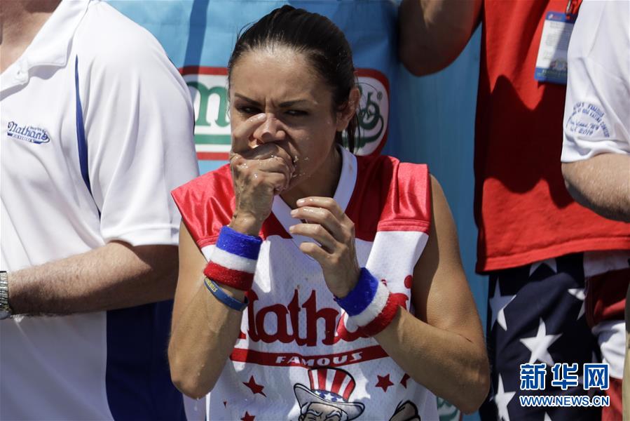 7月4日,在美國紐約康尼島,一名女選手參加吃熱狗大賽。新華社記者 李木子 攝