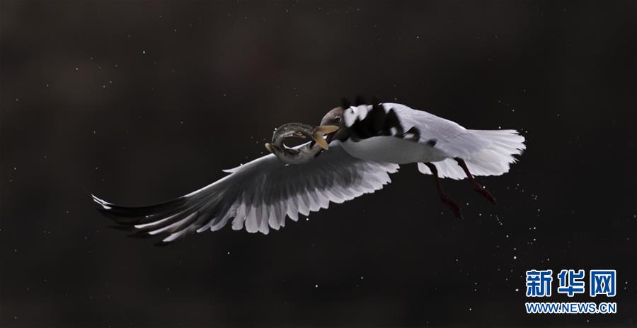7月6日,在青海省剛察縣沙柳河,一只棕頭鷗捕捉到一只湟魚后飛離水面。 新華社記者 費茂華攝