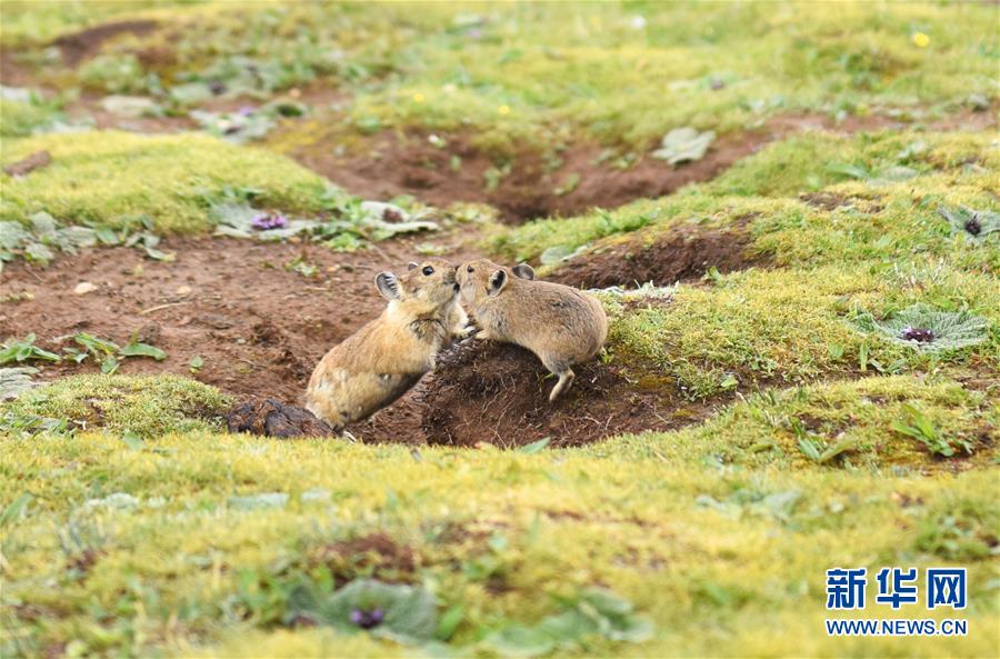7月6日,兩只高原鼠兔在西藏思金拉錯湖邊嬉戲。 新華社記者 周錦帥 攝