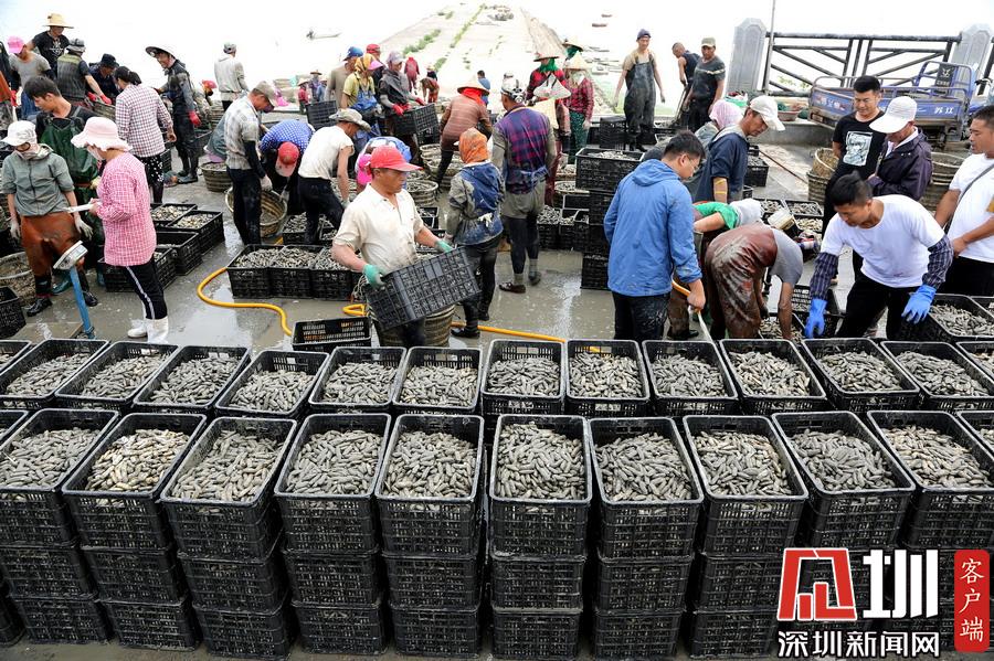2019年7月9日,漁民們?cè)诮K連云港沿海地區(qū)海邊的灘涂上將剛收獲的海蟶運(yùn)送上岸裝箱外運(yùn)。