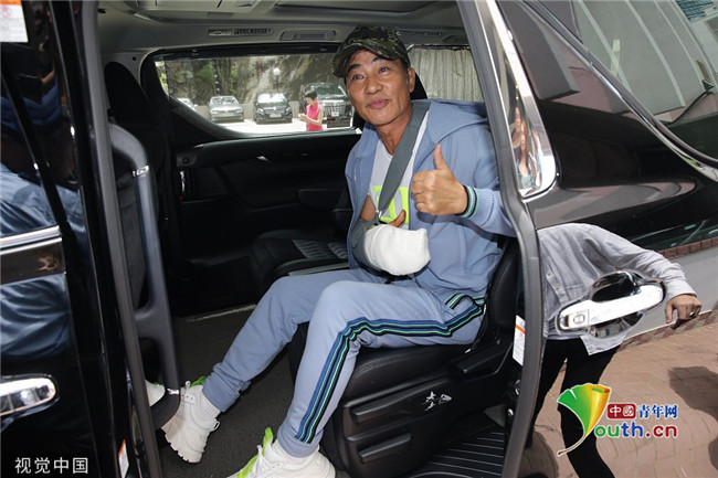 2019年7月24日,香港,任達華出院。他身穿藍色運動外套走出醫(yī)院,頭戴鴨舌帽,受傷的右手則套上白色護臂帶,面帶笑容,精神狀態(tài)非常好。