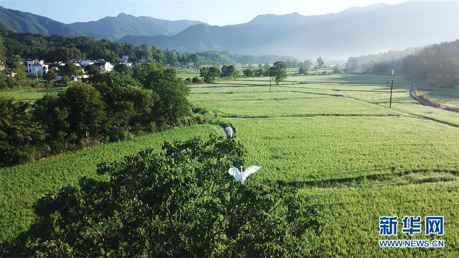這是8月4日無人機拍攝的安徽黟縣宏村風景區(qū)附近的農田晨景。新華社記者 張端 攝