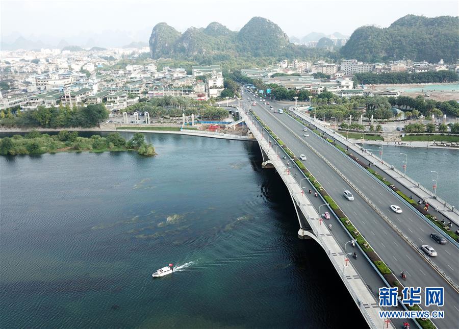 船只從橫跨漓江的廣西桂林市解放橋旁駛過(guò)(10月17日無(wú)人機(jī)拍攝)。 新華社記者 周華 攝
