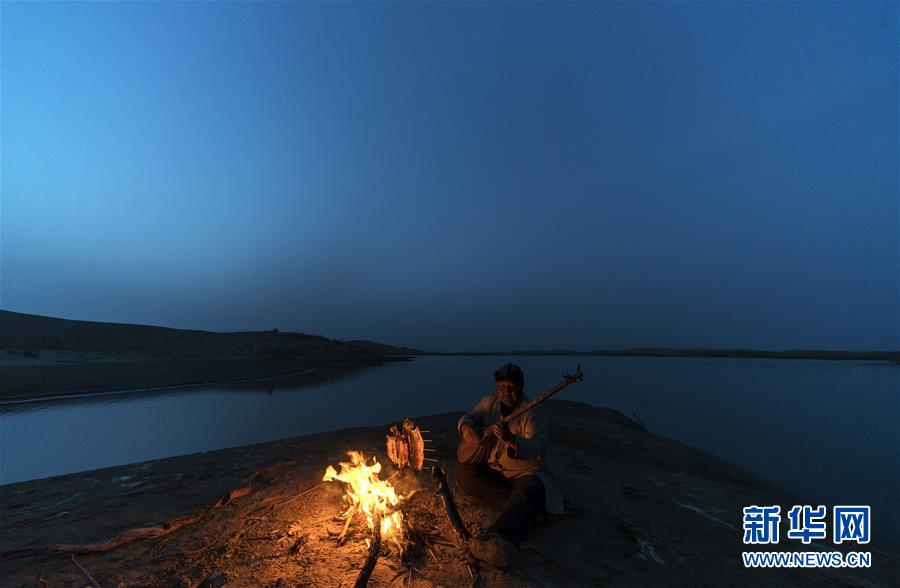 在羅布人村寨,阿木東·艾不東在沙漠里的一處海子旁彈奏樂器,等待烤魚烤熟(4月11日攝)。新華社記者 盧燁 攝