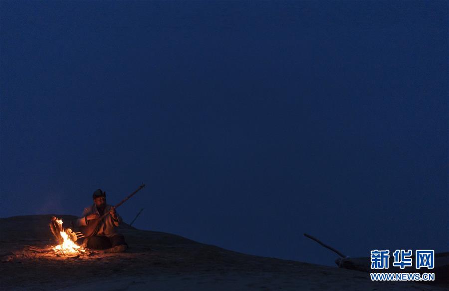 在羅布人村寨,阿木東·艾不東在沙漠里的一處海子旁彈奏樂器,等待烤魚烤熟(4月11日攝)。新華社記者 趙戈 攝