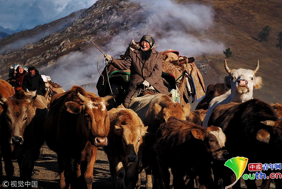 哈薩克族牧民趕著牛羊遷徙。