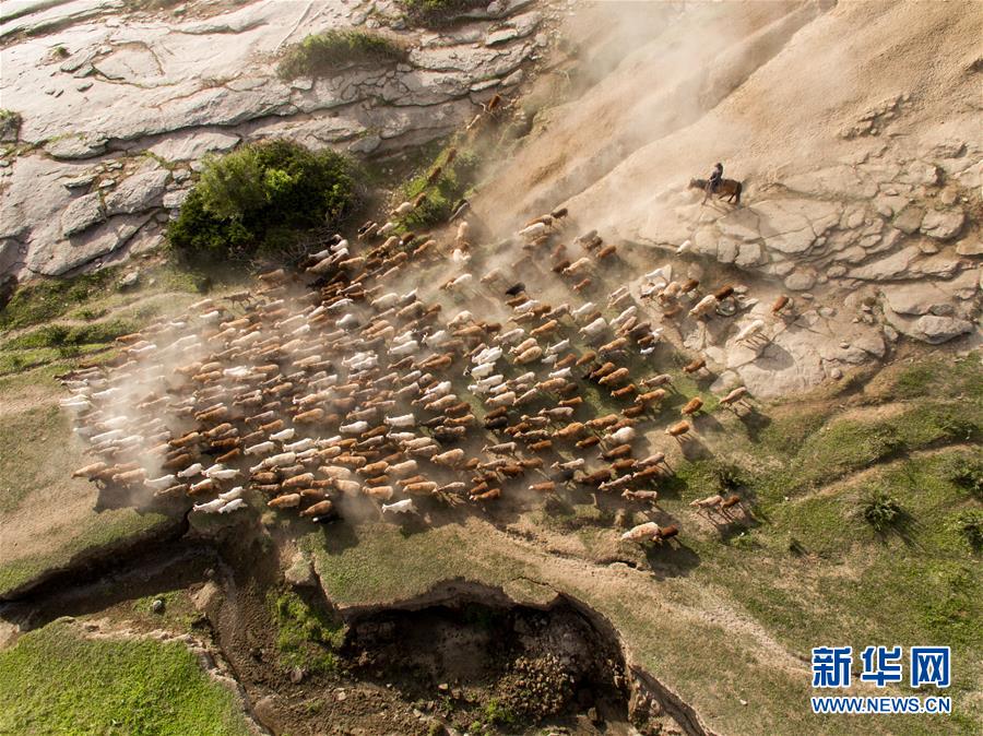新疆阿勒泰地區(qū)福??h牧民趕著牲畜向夏季牧場(chǎng)遷徙(6月6日無(wú)人機(jī)拍攝)。新華社記者丁磊攝