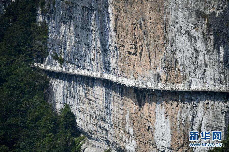游客在重慶金佛山風(fēng)景區(qū)內(nèi)的絕壁棧道上游覽體驗(yàn)(8月20日攝)。 新華社記者 劉潺 攝