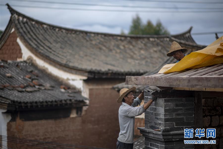 在石屏縣異龍鎮(zhèn)符家營村211號民居,工人王艷華在修繕屋頂(8月8日攝)。新華社記者 江文耀 攝
