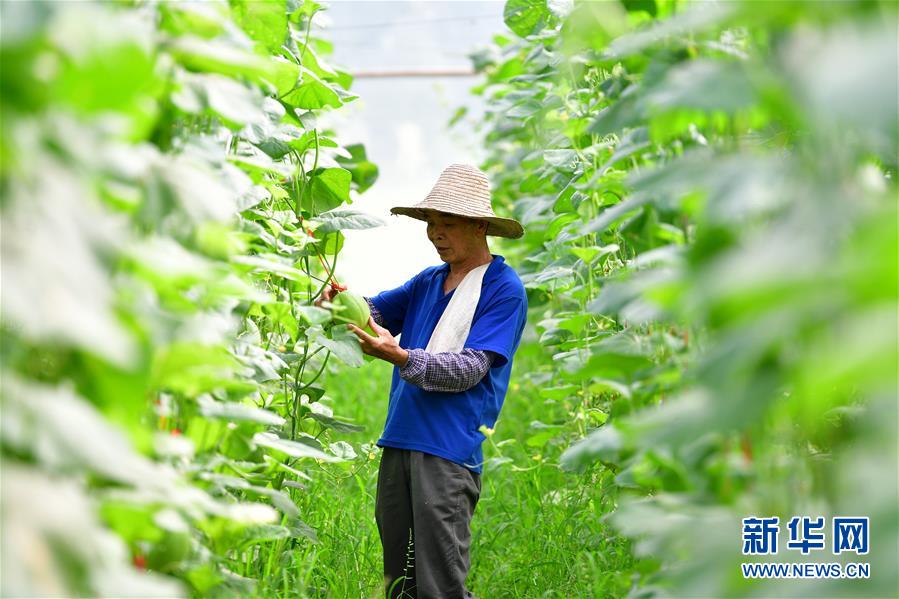 在廣西融安縣大良鎮(zhèn)古蘭村古蘭屯大棚基地,62歲的黃顯亮查看甜瓜生長情況(8月18日攝)。黃顯亮是大棚基地的技術(shù)員,每個月有3000多元的工資,已于2018年實現(xiàn)脫貧。 新華社記者 黃孝邦 攝