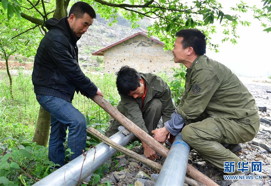 龍革雄(右)和堂兄弟們在架設(shè)引水管道(2017年4月7日攝)。新華社記者 黃孝邦 攝